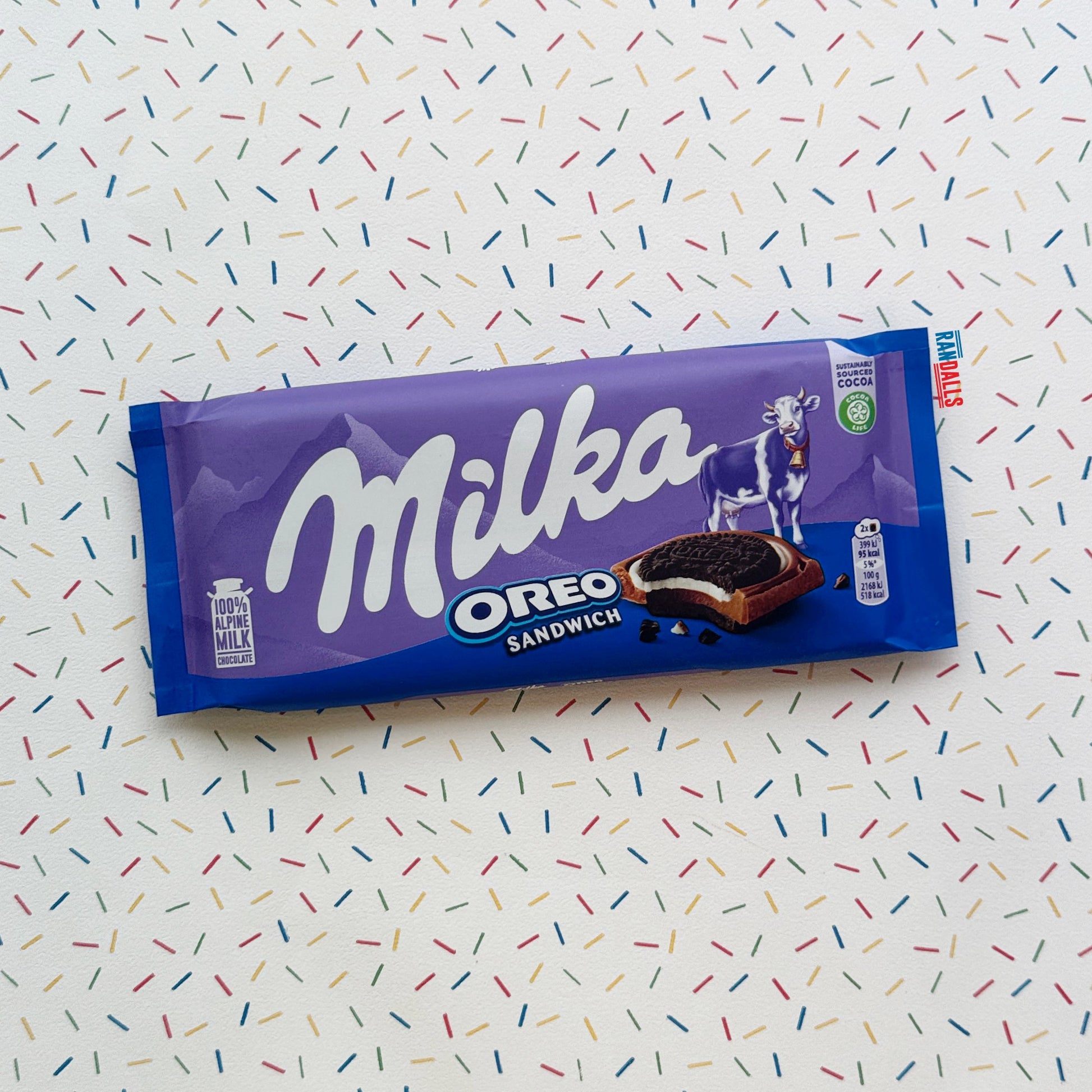 Double the deliciousness! The Milka Oreo Sandwich bar brings together smooth Alpine milk chocolate, crunchy mini Oreo biscuits, and a sweet creamy vanilla filling. Each square is layered with the iconic taste of Oreo and wrapped in silky Milka chocolate.